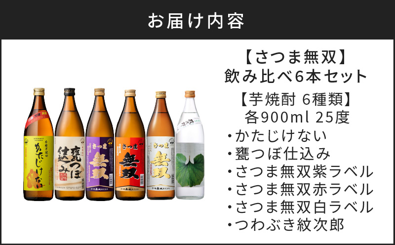 代表銘柄「さつま無双」の3種に、こだわりの3種を加えた飲み比べセットをご用意いたしました。